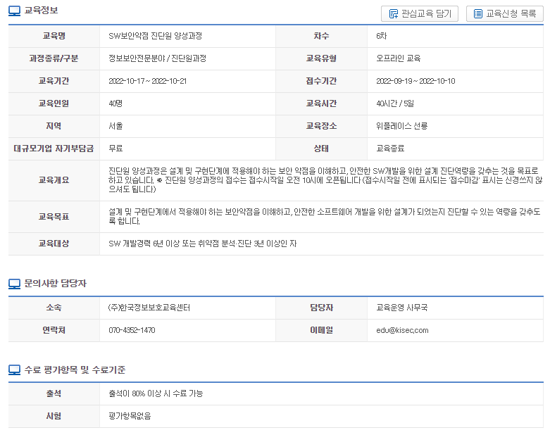 - 기본요건을 만족하고 SW보안약점 진단원 양성과정(40시간)을 이수한 자