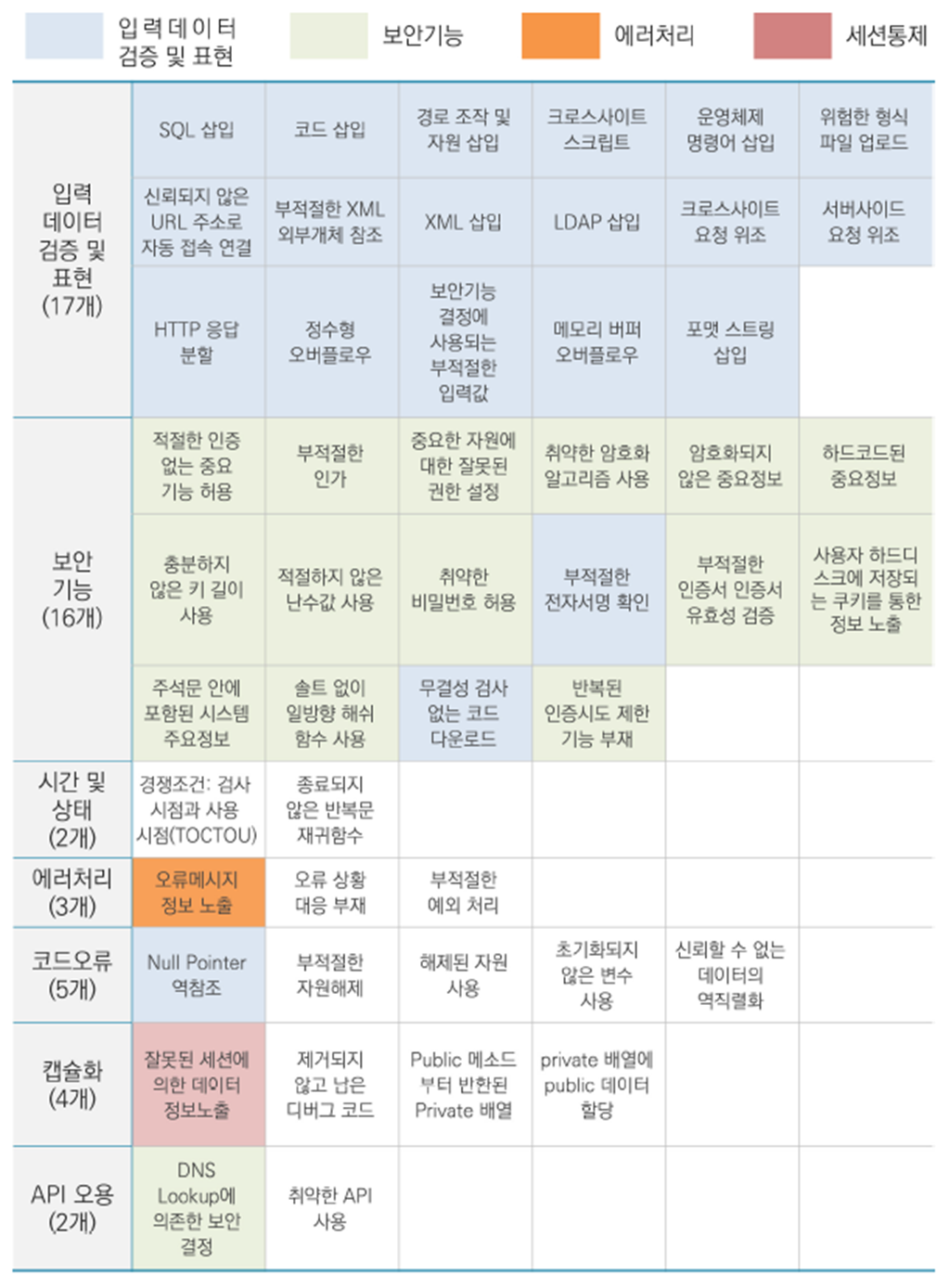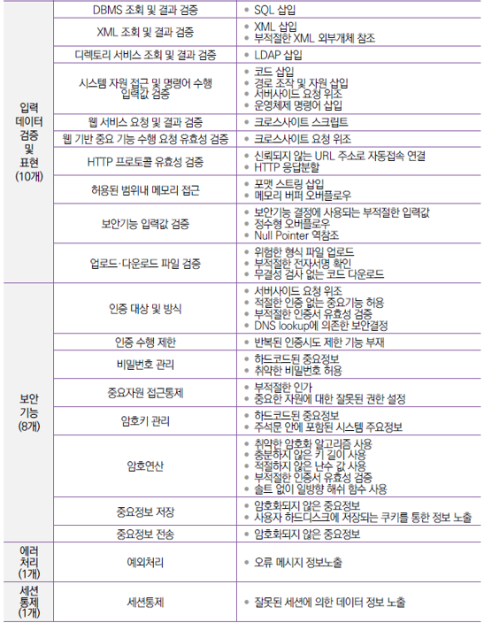 출처 : KISA 소프트웨어 보안약점 진단가이드 (2021.11) 소프트웨어 개발보안 가이드 (2021.12) 모바일 대민서비스 보안취약점 점검 가이드 (2021.12) 공개SW를 활용한 소프트웨어 개발보안 점검가이드 (2