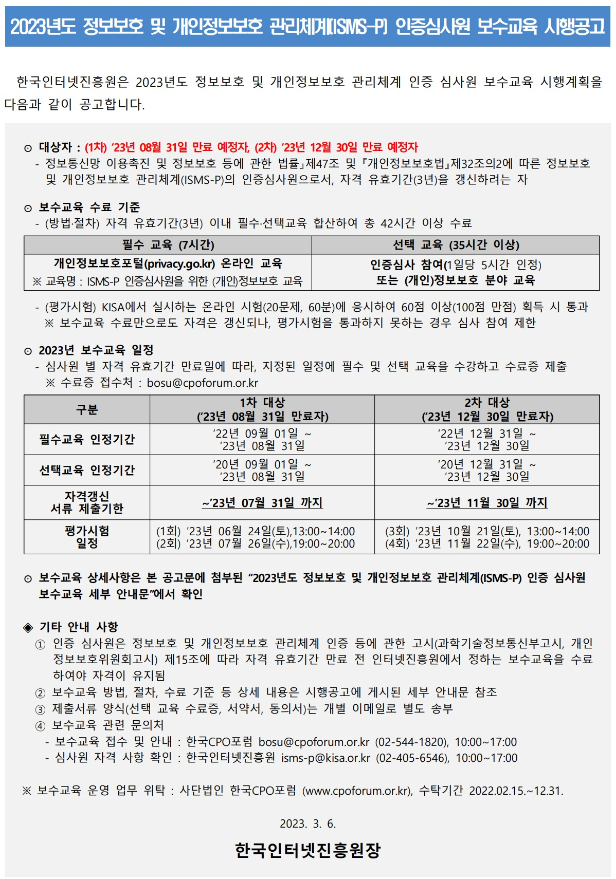 2023년도 정보보호 및 개인정보보호 관리체계(ISMS-P) 인증 심사원 보수교육 시행공고