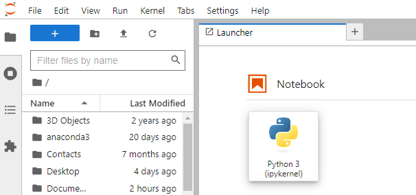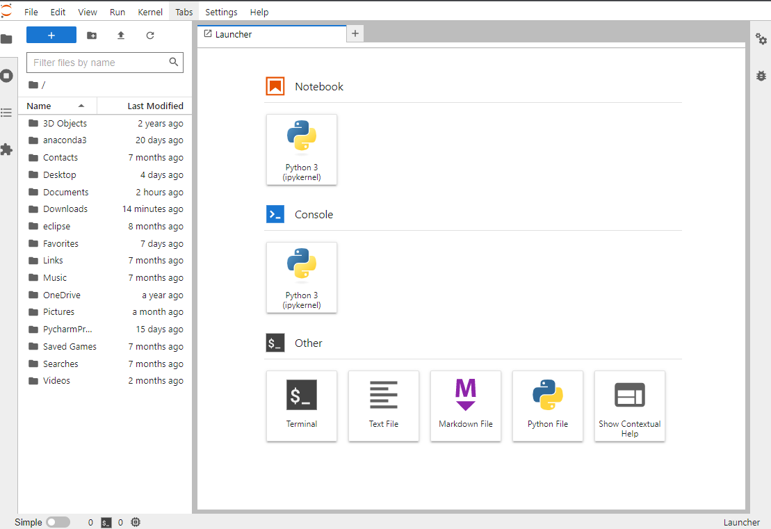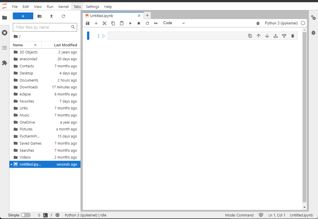 Anaconda Prompt 창에서 jupyter lab을 입력하면 JupyterLab이 웹페이지에서 실행됩니다.