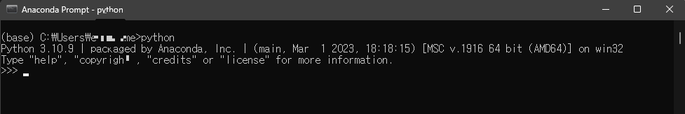 윈도우 검색창에서 'Anaconda Prompt'를 검색하여 실행하고, python을 입력합니다.