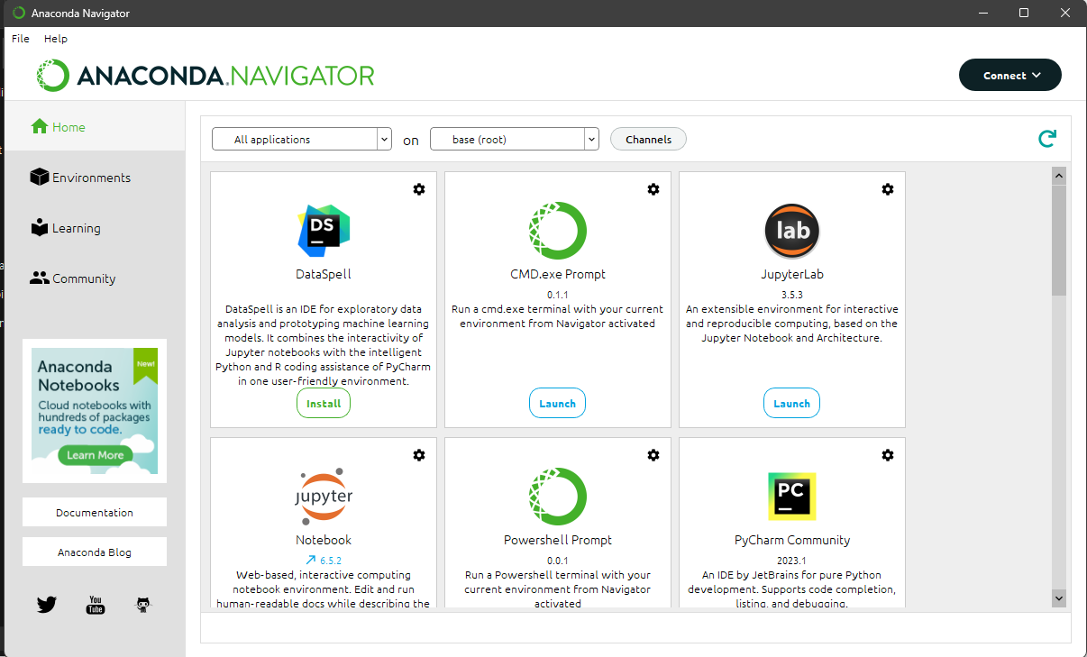 Anaconda Navigator 화면에서 여러 소프트웨어가 설치되었음을 확인하고 종료합니다.