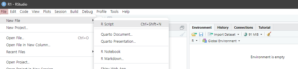 R 스크립트를 작성하기 위하여 R Script 메뉴를 선택합니다.