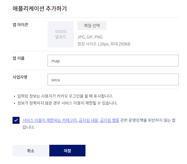 앱이름과 사업자명을 작성하고 체크항목을 체크한 다음에 '저장' 버튼을 클릭합니다.