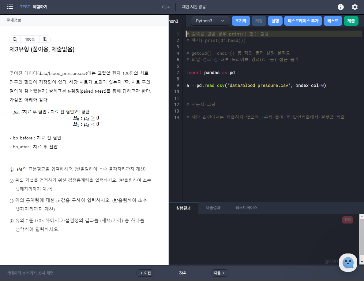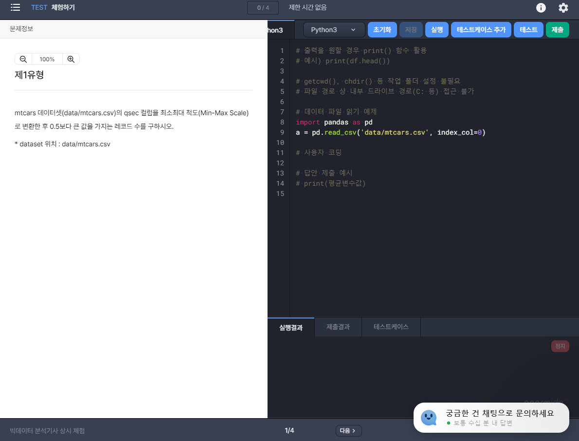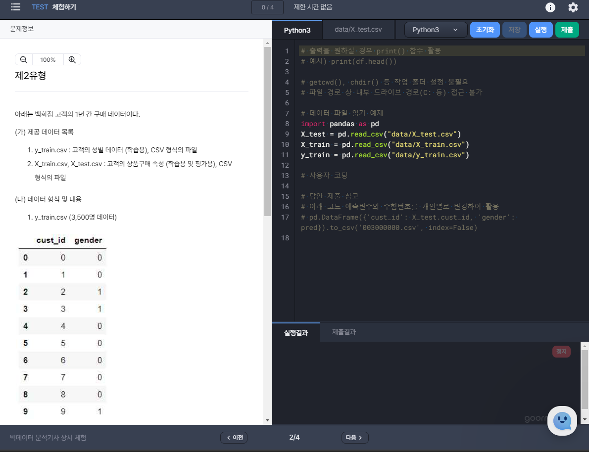o 작업형 문제 화면에서 R 또는 Python 중 언어 선택 가능