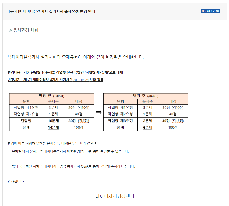 [공지]빅데이터분석기사 실기시험 출제유형 변경 안내