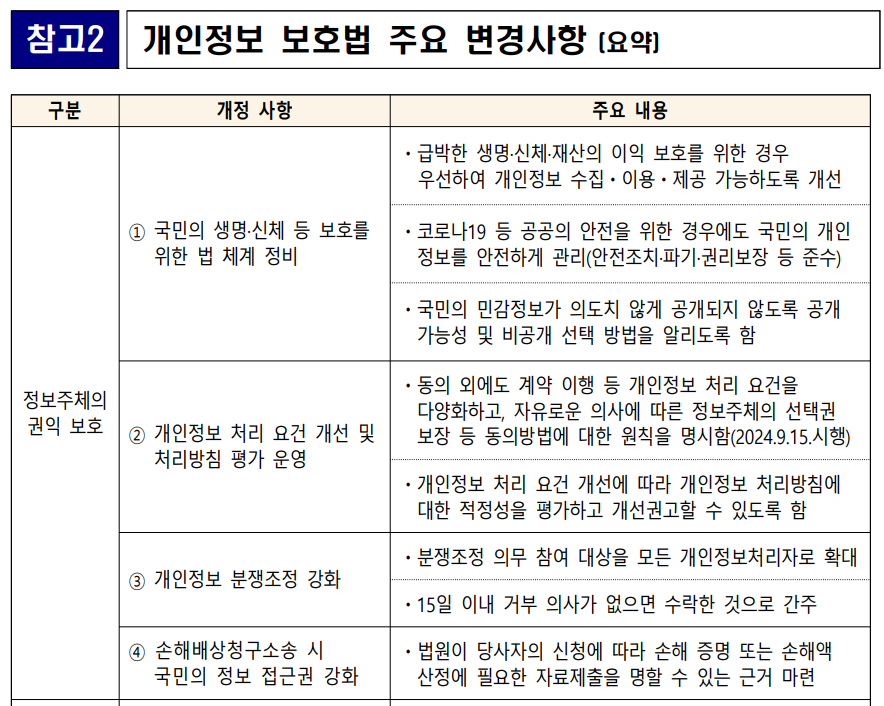 2023년 9월 15일에 시행되는 개인정보보호법 2차 개정 주요 변경사항입니다.